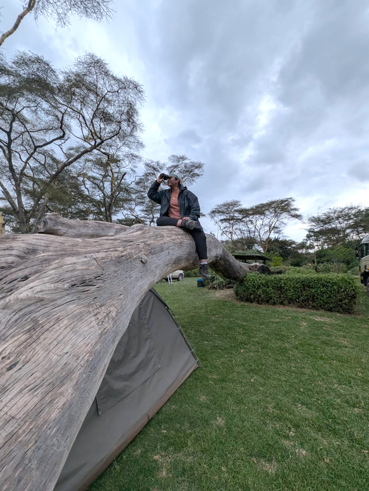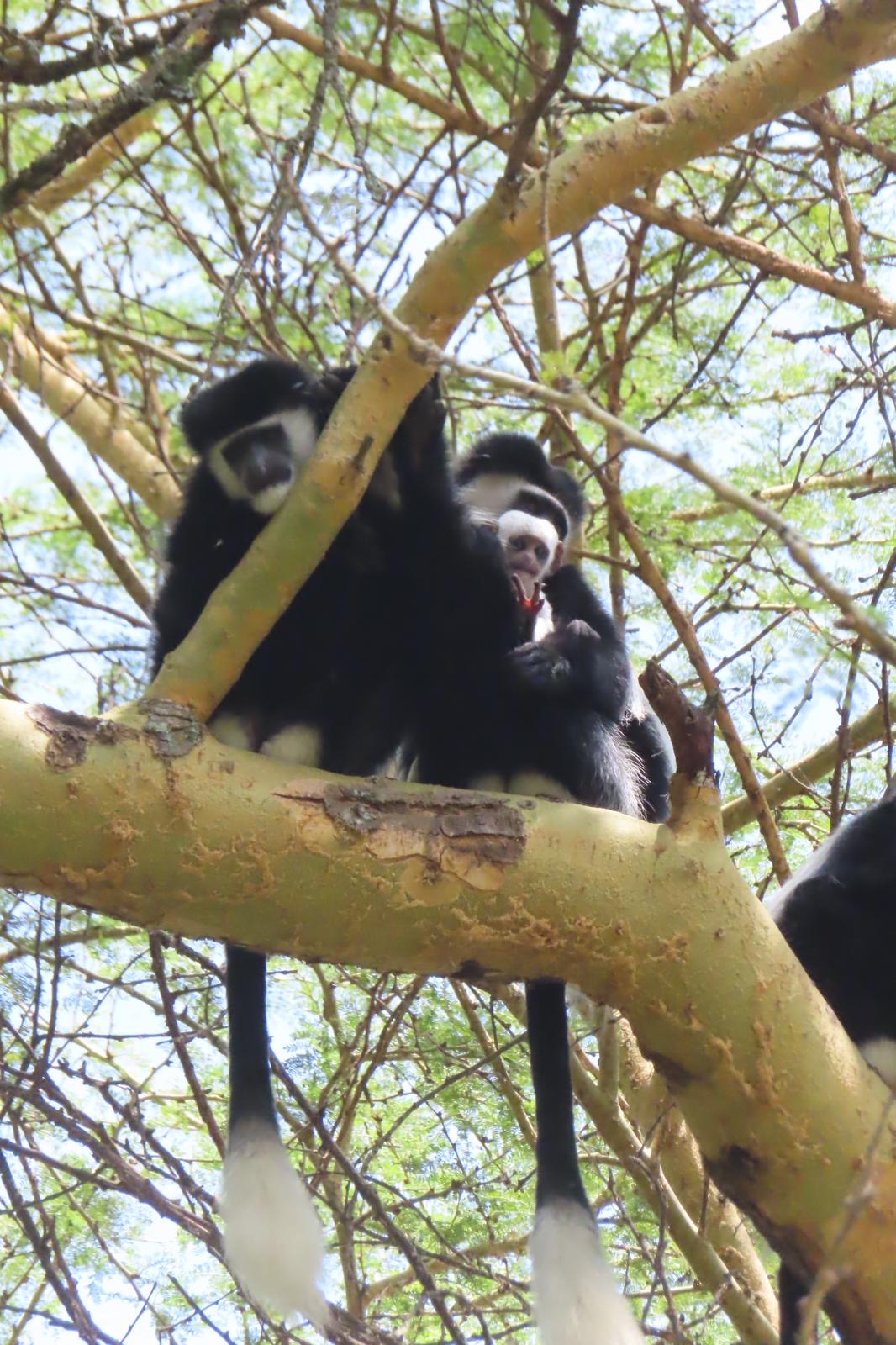 Much later in the distance, the leaping colobus monkeys made themselves known in the statuesque fever trees, leaping from branches with their white mantles used as parachutes, quite the display. Following that monkey business, Yiling got off to a great birding start as she saw flamingos flying in the distance to Lake Nakuru.