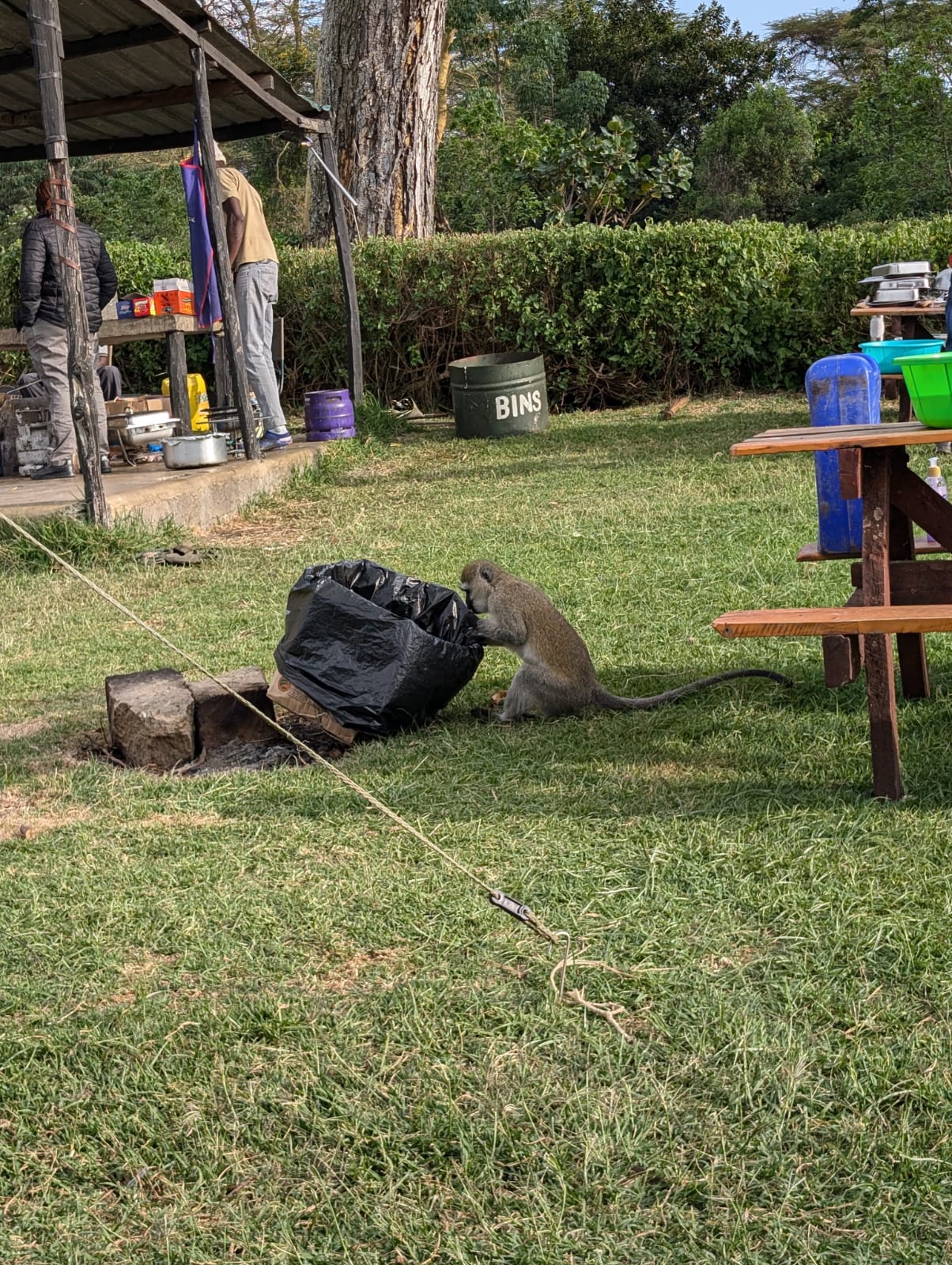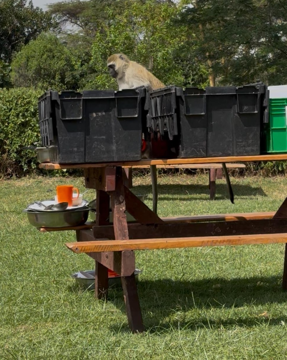The Egyptian geese and hadada ibis added to the chorus of wake up alarms. Once awake, you could find yourself making eye contact with two grazing cape buffalo. Who had mysteriously left from nearby Hellsgate National Park. While setting up breakfast, we had our first vervet monkey encounter of two males and three small females ready to raid unaware tents.